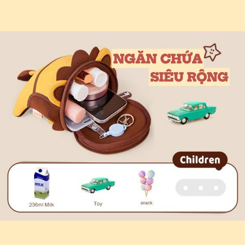 Phần khóa kéo của túi hoạt động mượt mà, dễ sử dụng, giúp bé có thể tự mở và đóng túi mà không cần nhờ đến người lớn. Điều này góp phần rèn luyện tính tự lập cho trẻ ngay từ những thói quen nhỏ hằng ngày. Kiểu dáng hình thú ngộ nghĩnh khiến chiếc túi không chỉ là phụ kiện đựng đồ mà còn giống như một người bạn nhỏ đồng hành cùng bé trong mỗi chuyến đi.